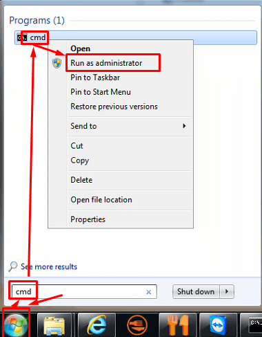 - Open DOS-prompt als Admin (zie 2de screenshot hieronder)