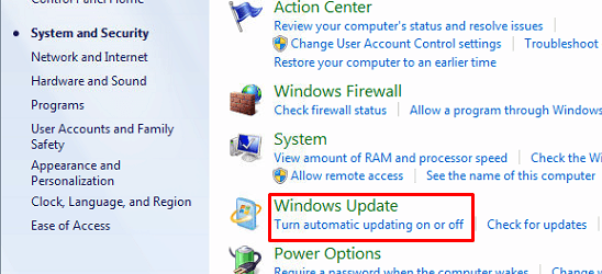 - Ga naar Start > Configuratiescherm / Control Panel > System and Security en zet Automatische updates uit: